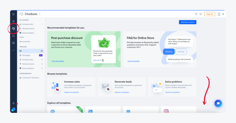 2. To build AI chatbots, go to the Chatbots tab and scroll down to the templates