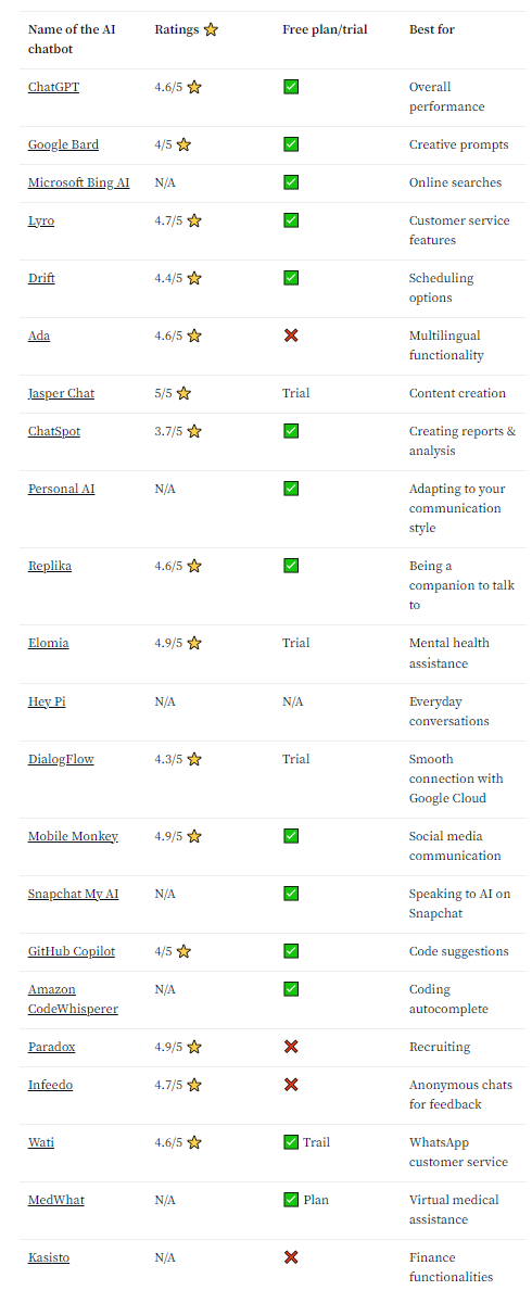 When it comes to business, three top-notch AI chatbots are Tidio, Drift, and Ada. On the personal front, the champions are MedWhat, Replica, and Elomia for those looking for chatbot companionship and assistance.
