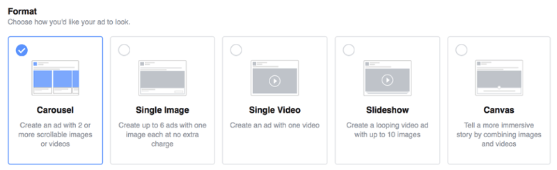 - Canvas: Canvas ads are more complicated than the other advertisement types—more on this below). It’s a single image, it’s a carousel. Normally, you’ll have one of the 5 ad types accessible, yet picking certain objectives (like “Get video view) may make certain advertisement types unavailable.