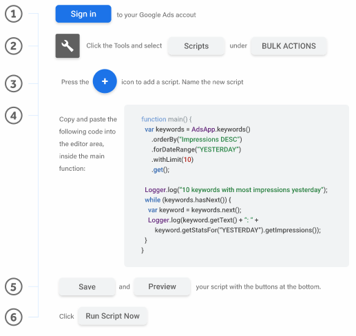 Making & running your first Google Ads script can be as simple as editing one of the pre-made scripts from Google’s library. Or then again you can make your own custom script with parts of different scripts. There’s no restriction to the potential outcomes.