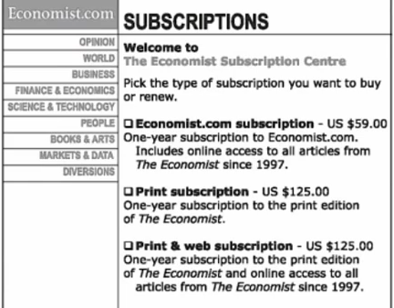 For instance, let’s take the pricing experiment that Dan Ariely ran. While looking at how 100 MIT students subscribed to The Economist, he noticed that 16 people chose A & 84 people chose C. They determined that B was useless, so it was removed as an option: