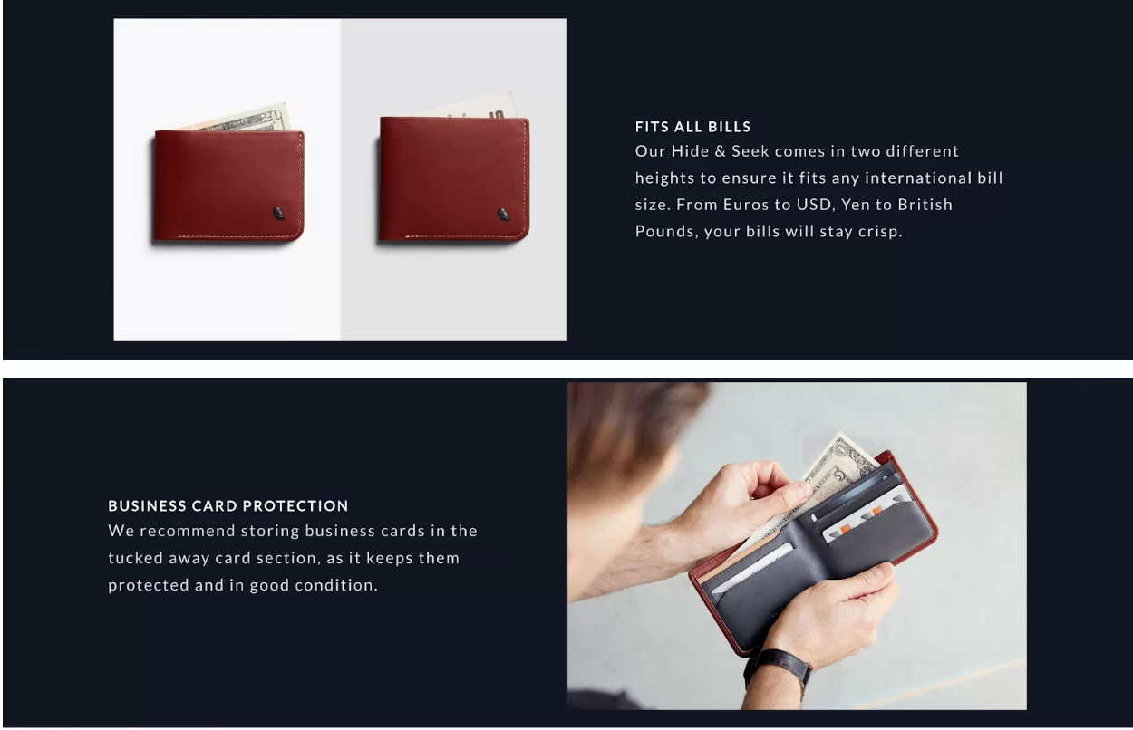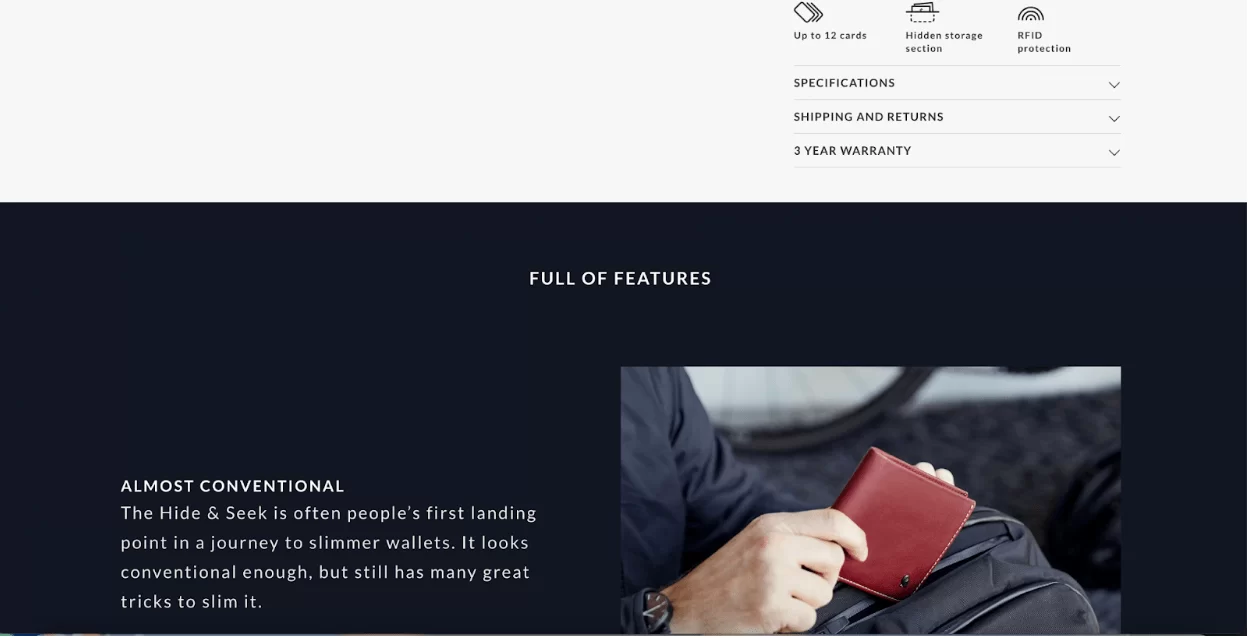 Each product page has all the information a customer needs. Here’s an example from the page for their Hide and Sleek wallet.