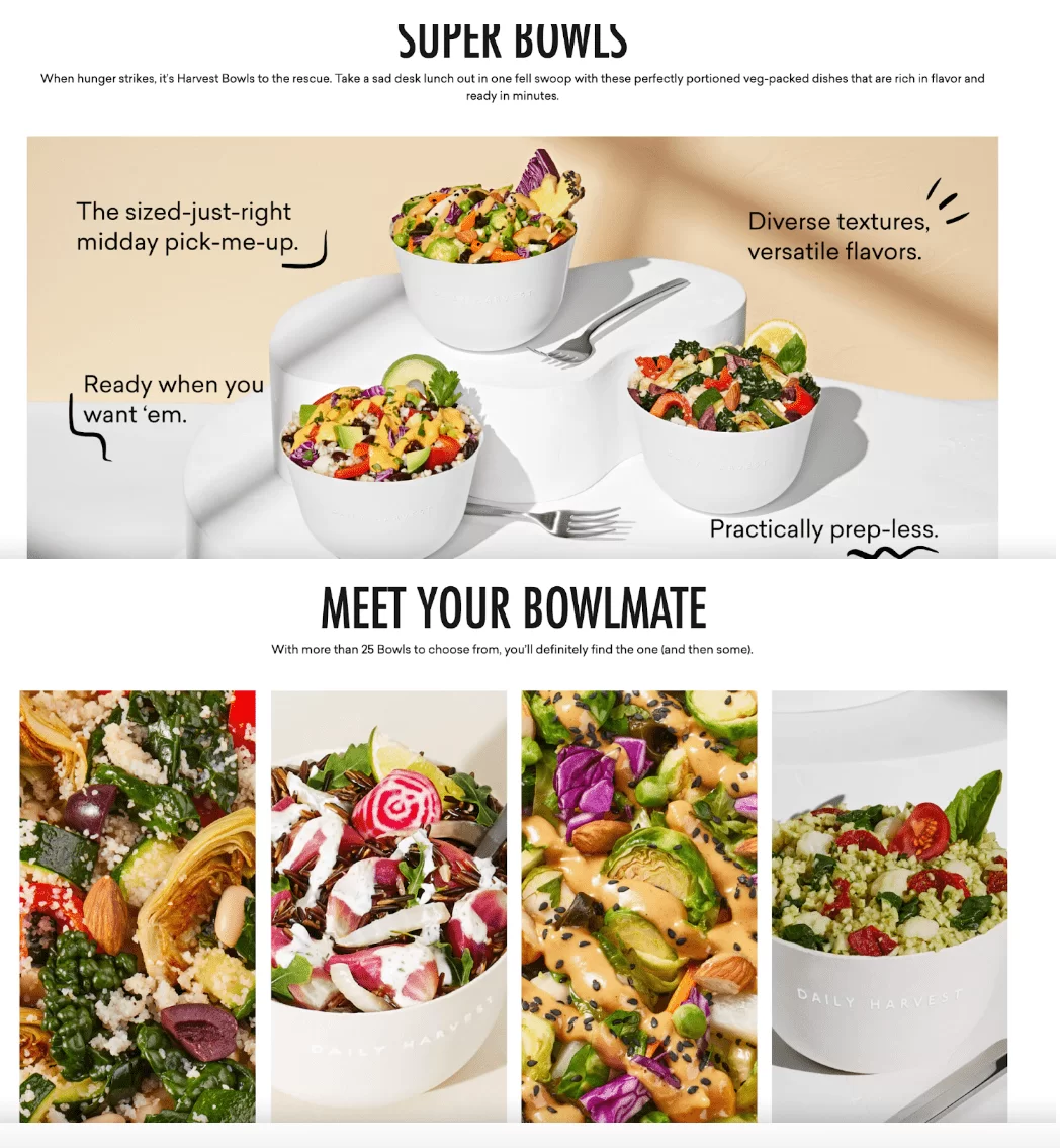 Not only does Daily Harvest kill it with vivid product images, but they also use the language of their customers in their messaging. They also provide easy-to-prepare recipes that help customers make the most of their bowls.