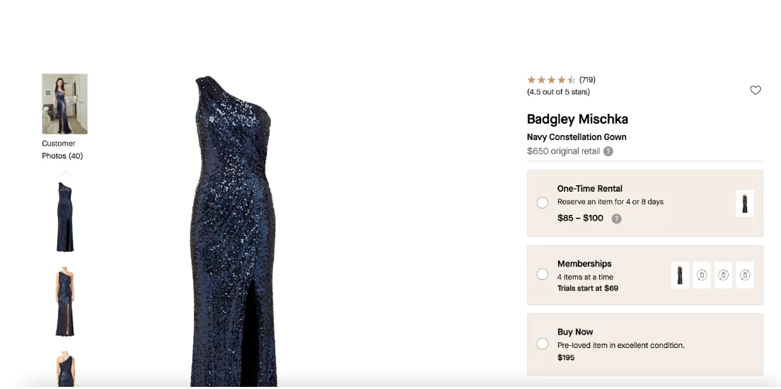 Another great feature of the page is that customers can select the buying option that’s best for them — one-time rental, memberships, or buy now. There’s also a comparison to the original retail price which is great for giving customers more context about pricing.
