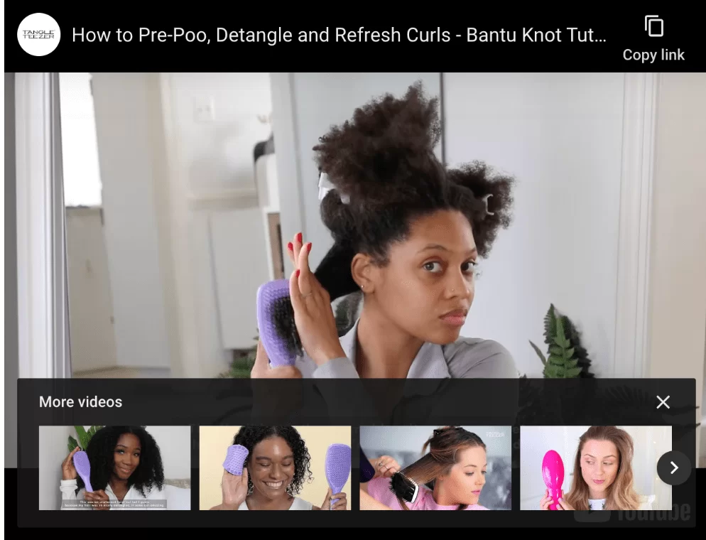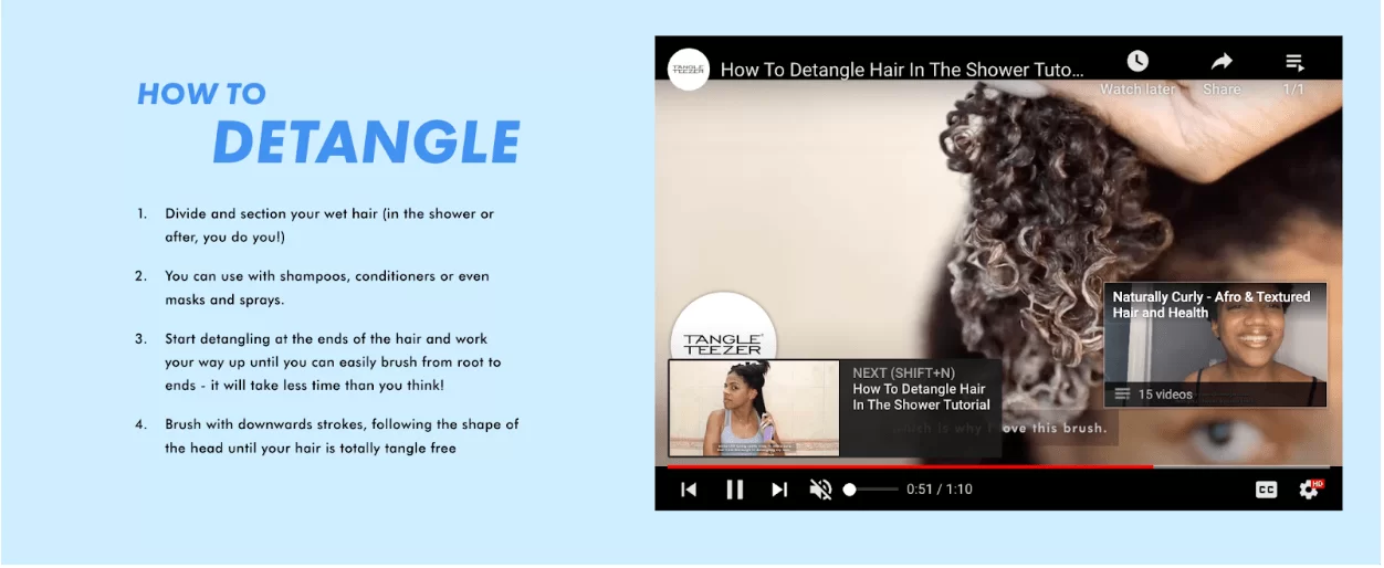 The video tutorial on Tangle Teezer’s Purple Passion brush product page is highly engaging for those in the market for a hair management tool for natural hair. The video features a woman with hair similar to the target audience, making it relatable and helpful.