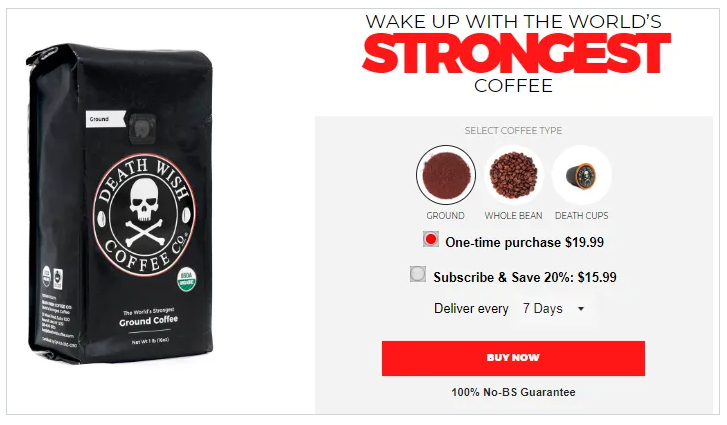 What’s more, to improve conversion, they add another trigger word to their single-sentence item slogan: The world’s strongest coffee.