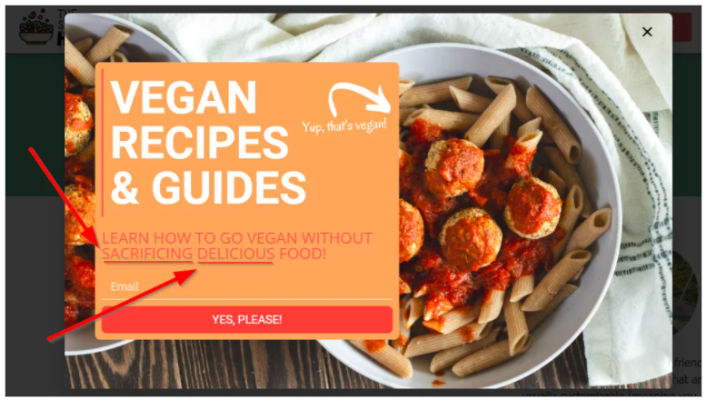 For instance, this pop up from The Sustainable Harvest utilizes the words “sacrificing” & “delicious” to tempt visitors into subscribing.