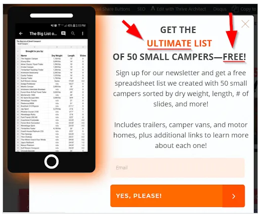 Or look at this pop-up on my site, The Wandering RV, which uses wording like “Ultimate” & “Free”.