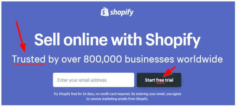Shopify’s free trial page, for instance, utilizes the words “trusted” & “free”.