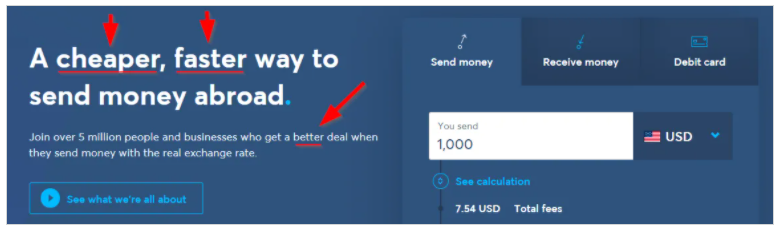 Or on the other hand take a gander at Transferwise, which uses phrasing like “faster” & “cheaper”.